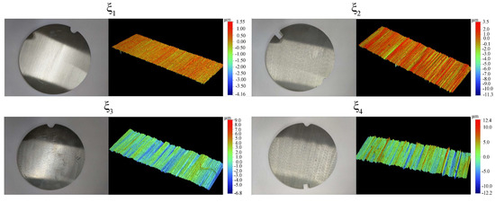 To study the effect of wall roughness on the fuel film’s characteristics, four circular cold-rolled steel plates with different surface roughness types (Sq = 0.24 µm, 1.00 µm, 1.84 µm, 2.59 µm) have been used. The plate shape is identical and their diameter and thickness are 95 mm and 3 mm, respectively. One surface of each plate is ground by the grinding machine and a small area has been cut to measure the wall roughness by using a 3D optical profiler. The plates and corresponding measured area’s microtopography are shown in Figure 2 with each number following ξ. For most previous papers analyzed above (Section 1), researchers always focused on the linear evaluation parameter of surface roughness (Ra or Rq), but it could only reflect the one-dimensional micro-texture height distribution. In this work, we used mainly the root mean square height Sq to analyze the influence of roughness on the fuel film. It is Rq’s areal expansion with two-dimensional form and it can represent the practical roughness of the plate surface in most cases so that it will have a real impact on droplets’ spreading during the impingement process. Numbers that follow ξ are arranged according to the value of Sq from smallest to largest, which means that the ξ1 plate is smoothest and ξ4 is rougher than the others. The results of the wall roughness parameters of these plates are shown in Figure 3. Table 2 provides the formula definition where z (x, y) is the height of the measured points in the (x, y) two-dimensional planes and “A” is the area of the measured region. Result of Figure 3 shows that Sa and Sq both have the same development trend for their averaging characteristics. The averaged performance also influences the maximum height and Sz has a similar changing trend with Sa and Sq. The differences of Ssk among ξ1, ξ3, and ξ4 are small, but which of ξ2 is lower obviously than others. The relationship of the overall concave–convex extent of the wall and Ssk is that, if Ssk < 0, the surface microstructure shows a high height distribution, so it implies that the convex extent of ξ2 is relatively significant. Additional details on these roughness parameters are given in Reference [37].