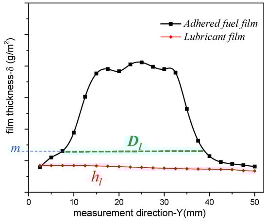 A fusion deformation of liquid film in a short time after adhering will cause a distortion in measurement results. As shown in Figure 4, we make the longitudinal section profile in the middle of the film with 20 points of film thickness that represent the three-dimensional accumulation of adhered fuel film to show the integral film thickness distribution. The entire measurement length is 50 mm in the Y-axis direction (see Figure 1b).