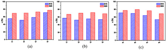 Figure 5 shows the adhered fuel mass ratio (ε) of the n-butanol/diesel blended fuels with 15% and 25% blending ratios at different roughness types for dry walls (a); FWW (b); and SWW (c). Regardless of whether the wall is dry or wet, the adhering ratio of B25 is higher than that of B15. This result may be consistent with Reference [32], which shows that higher n-butanol ratios imply a lower spreading radius and higher impinged spray heights interact with air. Due to the normal pressure and temperature, the masses for evaporation of the two blends that were sprayed before impinging were not significantly different. Due to the high injection pressure and the same injection pulse for the defined fuel-injected volume, the lower density of B25 implies a lower momentum for wall impact so that the rebounded mass will be less than that of B15. Combined with the decrease in viscosity and surface tension to lower the spreading resistance, an explanation can be provided for the phenomenon that, although trends for the two blended fuels are similar under dry wall or FWW conditions (Figure 5a,b), differences in ε between these walls become insignificant for B25.