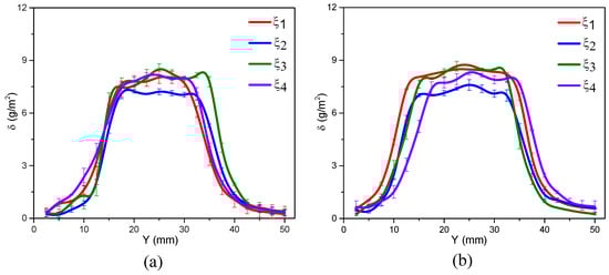 After fuel has impinged on the wall and splashed, the adhered liquid will gather and form a “mountain-like” film, which evaporates and mixes with environmental air to form combustible gas. At the same time, the distribution of fuel film influences the speed of evaporation. Figure 6 shows longitudinal section profiles of the adhered film for B15 and B25 blends with a change in roughness of the dry wall conditions. Most film peaks appear as a “W” shape, which means that a concave-ring exists around the central point of the impinged beam. Ring formation results because, after the liquid fuel impact on the wall, adhered fuel will accumulate at the impinging point and try to spread. Air has an entrainment effect on the spreading film edge, forms a resistance, and raises the edge. The liquid fuel surface tension makes the film edge rebound to the center at the same time. At this point, the B25 peak widths with a lower surface tension are larger than those of B15. Few differences exist among the height of these film peaks except on the ξ2 wall. As described in Reference [39], this result implies that the impact of wall roughness on the impinging characteristic cannot be only required by average measured parameters such as Ra. In this work, we have found that the particularity of ξ2 is that the skewness of the height distribution, Ssk, is lower than the other three plates and it means a higher convex extent is analyzed above. Therefore, with a fuel-droplet impact, the bounced mass will increase and the adhered film will be thinner. It also means that the roughness parameter Ssk of the surface has an important influence on the distribution of adhered film during the impingement process under a dry wall condition.