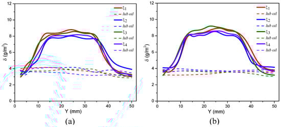 Figure 7 shows the longitudinal section profiles of the adhered fuel film for B15 and B25 blends with FWW conditions. The plates are covered by lubricating oil with a fixed thickness (3–4 g/m2). The different dotted lines represent the original lube oil film thickness for each wall. Compared with the dry wall conditions, the concave-ring phenomenon still exists on FWW for the same reason as mentioned above. However, adhered peaks have a wider and flatter shape and the difference between these films is smaller. In combination with the analysis for the adhered fuel mass ratio, if the thickness of the original oil film is larger than the roughness parameter Sq, the lube oil’s fusion effect plays a leading role in fuel spreading, which changes the peak shape rapidly and tends to spread over a larger area.