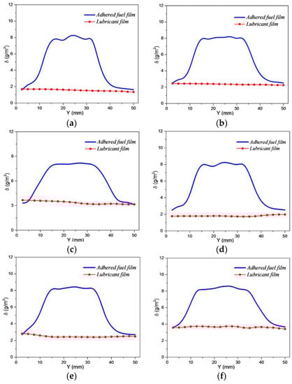 Longitudinal section profiles of adhered fuel film under SWW conditions: (a–c) B15 with different lubricant film thicknesses; (d–f) B25 with different lubricant film thicknesses.