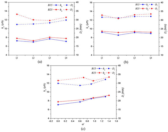 Figure 9 shows the development of average thickness (ha) and accumulated diameter (Dl) of the adhered film after spray impingement of B15 and B25 blends under three wall conditions. To provide reasonable contrast results, the weak impact of the density of lubricating oil is ignored and units of ha are converted from (g/m2) to (µm). Under almost all conditions, ha and Dl of B25 are higher than those of B15 and the reason for this result can be added from the results of the adhering fuel ratio ε for the lower rebounded mass of B25. Under dry wall conditions shown in Figure 9a, the variation in Dl increases slowly with an increase in Sq. A larger Sq means a larger resistance for spreading adhered fuel, which causes more fuel to gather at the impact point. Due to the larger accumulated diameter with more adhered fuel mass, the change in ha with a different wall roughness is small, which implies that the roughness at this work scale is not the major factor that affects the adhered film’s average thickness. Under FWW conditions, according to the above analysis, the influence of roughness is not clear after the lube oil has almost covered the wall surface texture. For SWW conditions, ha and Dl mostly increase with a rise in φ’. As the original lubricant film thickness increases, the fusion effect increases gradually and then promotes the spreading of adhered fuel away from the impingement point, which increases Dl. An increased hl improves the initial measured value m in Equation (4), increases the average film thickness ha, and emphasizes the important influence of splashing lube oil mass Δml on the decrease in ε, which is shown in Figure 5c.