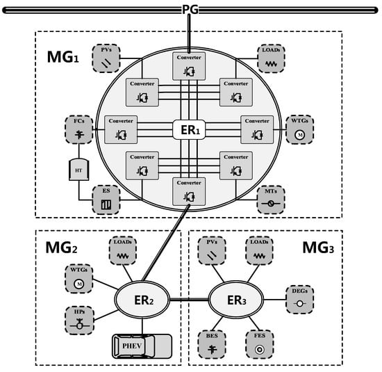 A series-shaped EI is studied in this article. , and are connected successively. In addition, we assume that is connected to PG. All of the ERs are designed to be based on AC bus lines. Figure 1 shows the topology of the studied EI system.