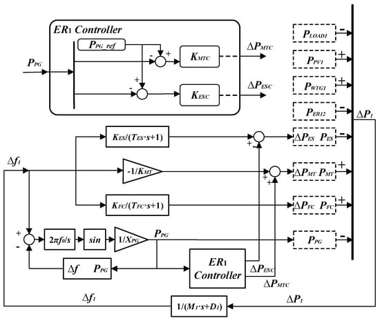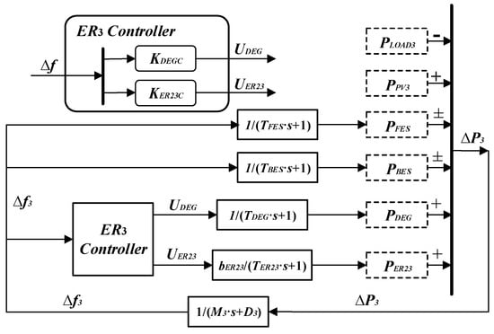 We assume that is only connected with and these two MGs are far away from each other. Thus, the dynamic response of power transmission line is slower than that of local devices in . Assuming that is sensitive to power deviation, responsive energy storage devices such as BES and FES devices are essential to keep its power balance. In addition, another kind of highly controllable power generator, DEGs, have connections with . PV units and loads are also included in .