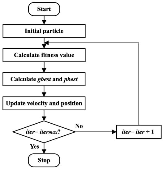 It is notable that the control problem described in Equations (28)–(29) can be solved by the PSO algorithm [31]. The flowchart of the PSO algorithm is shown in Figure 6, and the detailed implementation process is introduced as follows:
