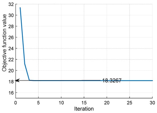 According to data in [21], [32] and [33], system parameters are given in Table 1. We assume that these parameters are valid for one hour only. In the next couple of hours, the values of system parameters shall be different and should be re-estimated. In this sense, our proposed method can be applied to any time period of a day without essential difficulty. For tracking performance, the reference input in Equation (22) is chosen to be . The parameters of PSO algorithm are: swarm size = 50; maximum iteration = 30; = 0.2; = 0.2; = 0.4 and = 0.9. According to the simulation results in Figure 7, the value of the optimized objective function is 18.3267.