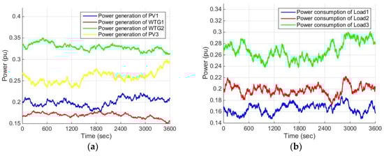 Local power generation and consumption; (a) power generation of photovoltaic (PV) units and wind turbine generator (WTGs); (b) power consumption of loads.