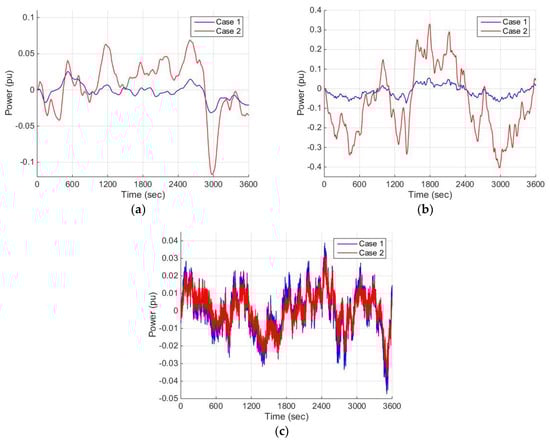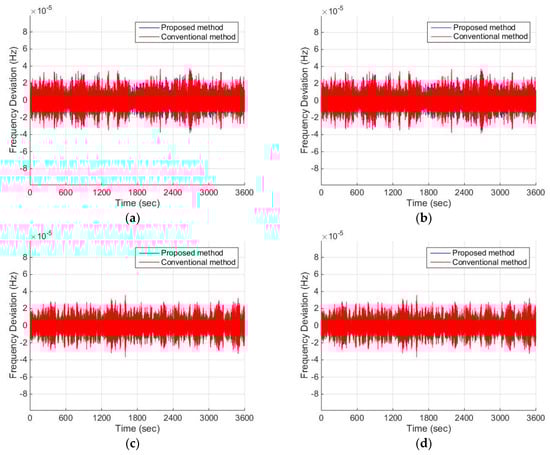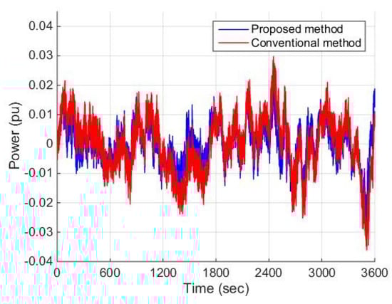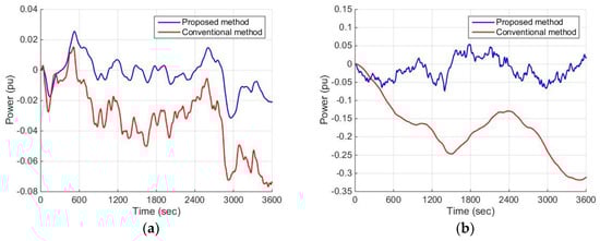 The controlled frequency deviation of obtained by both the proposed method and the conventional method are illustrated in Figure 9 including the following four situations: (a) without external disturbance or system parameter uncertainties; (b) with external disturbance only; (c) with system parameter uncertainties only; and (d) with both external disturbance and system parameter uncertainties. The frequency deviation of is relatively small, and the difference of the control effect of the proposed method and the conventional method is not obvious, which are due to the connection of to PG.