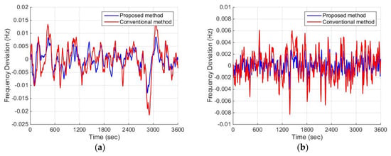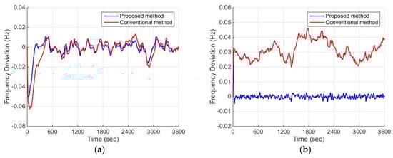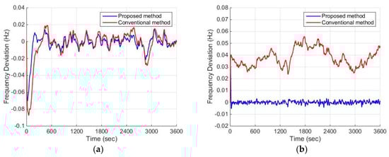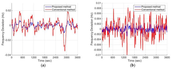 Frequency deviation without disturbance or uncertainties: (a) ; (b) .