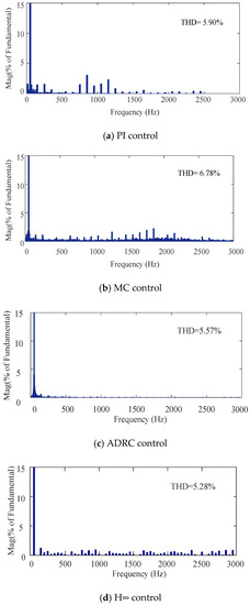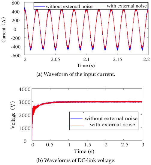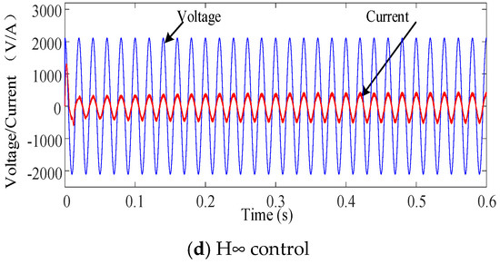 - In Table 4 and Table 5, the first set of data contains the original values of the model parameters. In Table 4, when the model parameter Rs decreases or Ls increases, the EMUs–traction network system becomes more unstable. LFO or a rectification failure will occur in the system based on PI control when the model parameters change, and the THD of the current will be large. In Table 5, the system is less affected when the model parameters change. Only when the model parameter Ls is expanded to 100 times will a rectification failure occur in the system based on H∞ control. Thus, H∞ control has better robustness than PI control.