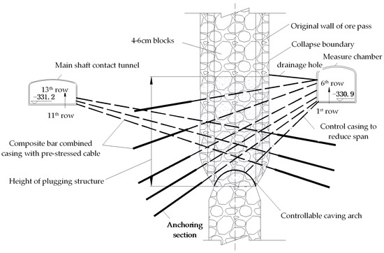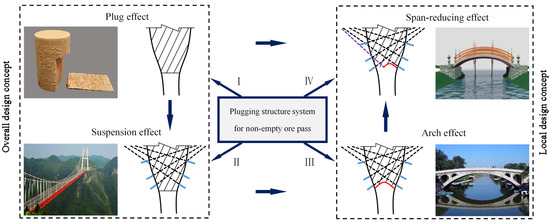 When constructing a structure-plugging system of ore passes which demands that the ore pass is in the non-empty condition and that no person enters inside it, some prominent problems must be fully considered, such as the random arrangement of different block sizes (ore powder, large ore blocks, collapsed waste rocks, etc.), large collapse span of the ore pass (>10 m), complex collapsed shapes, and vertical load caused by several hundred meters of loose rock mass. Therefore, the structure-plugging system should separately solve each problem and carry out multiple control countermeasures on the above problems, finally reaching an optimal outcome in the safety, efficiency, and low cost of the plugging engineering of the ore pass. In terms of the above prominent problems and based on the scientific and collaborative concept of overall design with local design, several effects, including of plug effect, suspension effect, arch effect, and span-reducing effect, have been applied to the design of the structure-plugging system of extensively collapsed long ore passes [2], as shown in Figure 1.