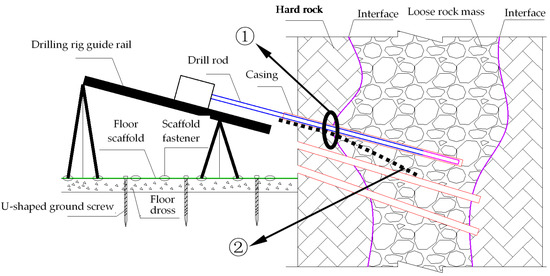(i) Frequent sticking. This phenomenon mainly occurs in the interface between hard rock and loose rock mass due to the high pneumatic DTH (down-the-hole drill) being unsuitable to loose rock mass (as is shown in ① of Figure 3).