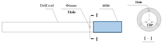 To solve this problem, three holes, where the mutual angle is 120° around the circumference of the drill rod, are drilled in the front section of the first drill rod connected with the DTH (Figure 4). The holes’ arrangement alters the wind current direction from being one-dimensional to three-dimensional near the DTH, so the rubble is moved away easily. This kind of drill rod can solve sticking in the DTH process, and in particular, it is significantly effective in preventing sticking in the complex and fractured ground.