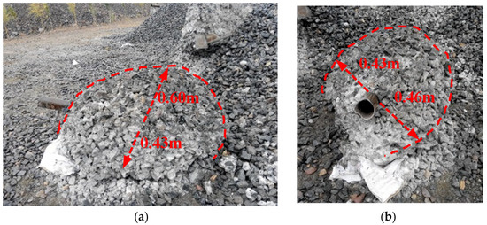 In order to obtain the diffusion characteristics of C–S grout in the seemingly homogeneous loose rock mass, a grouting test with casing is carried out for the rubble with their particle sizes ranging from 4 cm to 6 cm on the surface. The grouting test results (Figure 6) with the setting time of 18 s shows that the diffusion of C–S grout in the seemingly homogeneous loose rock mass is slightly affected by gravity, and the diffusion distance in the vertical direction is relatively long while the diffusion distance in the other five directions is essentially the same. It is believed that affected by grouting pressure, the diffusion of C–S grout in the seemingly homogeneous loose rock mass basically presents a characteristic of even diffusion into the surrounding area.
