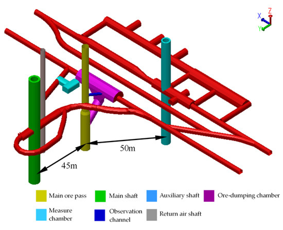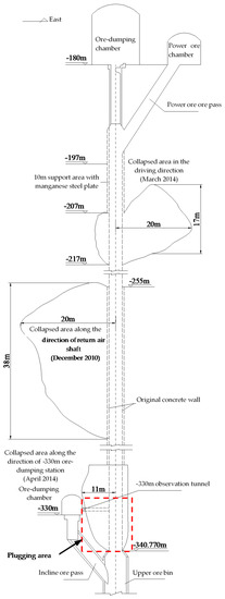 The Xingshan Iron Mine of the Shougang Corporation is an underground large-scale mine with an annual output of 3.2 million tons of ore. As the only main ore pass in the mine, it is responsible for the entire transport of all ore, which has become a threat of the mine. The main ore pass is 45 m away from the main shaft and 50 m from the auxiliary shaft (Figure 9).