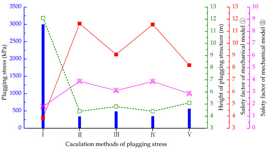 Figure 11. The design heights and safety factors of the plugging structure corresponding to different calculation methods of vertical stress.