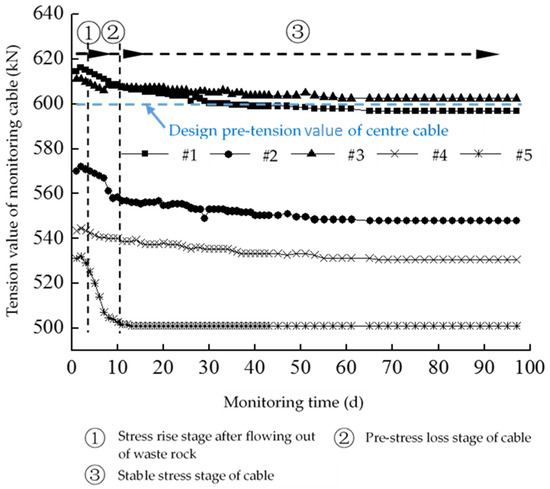 It can be seen from Figure 13 that after waste rocks below the plugging structure are lowered, the incline of the ore pass is immediately exposed and the plugging structure is kept stable. It indicates that the overall design and construction fully meet the requirements of use, waste rocks are lowered once, and the lower part below the main ore pass is not blocked. Within three months after the engineering is completed, persistent data monitoring of cable load sensors show that the entire plugging structure is stable (Figure 14).
