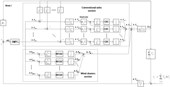 - Ma, M.; Liu, X.; Zhang, C. LFC for multi-area interconnected power system concerning wind turbines based on DMPC. IET Gener. Transm. Distrib. 2017, 11, 2689–2696. [Google Scholar] [CrossRef]