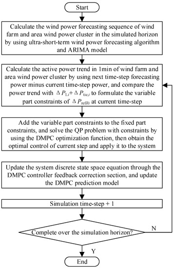 At the end of time-step k, DMPC controller obtains real measured value of through feedback correction. The value is used to replace the second element in Equation (23) to perform feedback correction to area wind power cluster forecasting model. Then subtracting third element by second element in Equation (23) to obtain the area wind power cluster output trend for next 1 min at time-step k + 1. After that, we compare it with at time-step k + 1, re-enter the above judgment process and perform rolling optimization. Looping operation until the simulation horizon is traversed, and the overall DMPC control strategy is described in Figure 2.