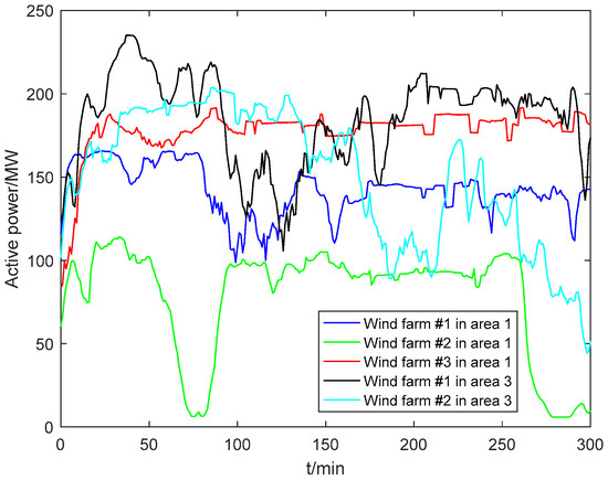 In this paper, a three-area interconnected power system is adopted, in which area 1 has a wind power cluster consisting of three wind farms with installed capacities of 172 MW, 121 MW and 202 MW, and area 3 has a wind power cluster consisted of two wind farms with installed capacities of 242 MW and 214 MW. An ultra-short-term wind power combination forecasting algorithm and ARIMA model are utilized to generate wind farm prediction power sequence datasets with a resolution of 1 min in the simulation horizon by using the measured wind speed data on 4 March 2016, as shown in Figure 3. The prediction root mean square errors (RMSE) of the combination forecasting algorithm in this paper is lower than that of monomer forecasting algorithm by comparing with actual active power of each wind farm, which are 7.86% of combination forecasting algorithm, 10.33% of LSSVM and 12.78% of BP neural network, respectively.