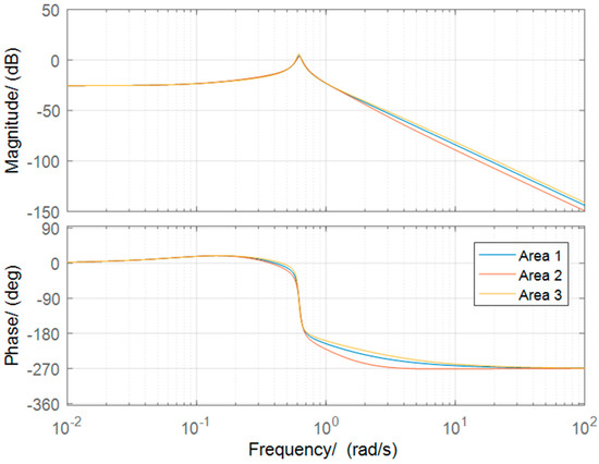 According to the parameters in Table 2 and multi-area interconnected power system frequency response control block diagram in Figure 1, the Mason formula is utilized to calculate the transfer function of each area and corresponding Bode diagrams are shown in Figure 4. According to the 0 dB line and −180° line in Figure 4, it can be confirmed that the system gain margin and phase margin are 2.4914 dB and 26.0716°, respectively, in area 1, 1.7985 dB and 22.7531°, respectively, in area 2, and 3.2096 dB and 24.7886°, respectively, in area 3. Therefore, the closed loop control system is proven to be stable in the point view of stability margin.