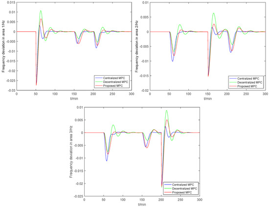 The area frequency deviation curves impacted by load step disturbances in 3-area system are shown in Figure 5, where it can be seen that when the loads suddenly increase, the system frequency decreases due to a power shortage in each area, and the generation supplies need to increase their active power outputs to compensate the shortfall. However, a load step disturbance in one area will result in frequency decreases in the other areas. For instance, when the simulation time is at 50 min, the load of area 1 suddenly increases, and the loads of area 2 and 3 remain unchanged. It can be seen from Figure 5 that frequencies in area 2 and area 3 also decrease, but their decrease amplitudes are smaller than that of area 1. Similar situations also occur when loads of area 2 and 3 suddenly increase. Therefore, certain active power is needed to be extracted in generations of each area at the same time. In Figure 5, from the amplitude comparisons of the area frequency deviations at load step disturbance occurring times, which are 50 min in area 1, 150 min in area 2 and 200 min in area 3, it can be derived that the control performance of centralized MPC is the best. This is because centralized MPC considers global variables and information to perform optimization, and there is no limitation imposing on optimization time in this situation of load step disturbances. It can also be seen that the control performance of proposed MPC is better than that of decentralized MPC, since decentralized MPC method only considers insufficient information of tie-line power in its calculation process. In contrast, the proposed DMPC control strategy has better control accuracy and frequency recovery ability because of its control mechanism of obtaining all information of other areas through high-speed communication system.
