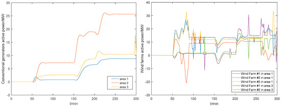 Active power control curves of conventional generators and wind farms controlled by proposed DMPC method are shown in Figure 6. It can be observed that wind power clusters controlled by DMPC method can effectively utilize wind energy with consideration of wind power forecasting information and reduce frequency control pressure of conventional generators. When wind power clusters cannot meet frequency regulation requirements alone, conventional generators could be involved in participating in frequency regulation with coordination of related wind power clusters (for example, t = 299 min in area 3).