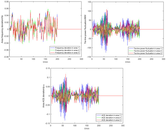 In this experiment, load random disturbances are considered in area 1 and area 3. The load disturbance in each area is divided into two stages in the simulation horizon: the first stage is 1–200 min, in which load disturbance is set to be 1 min resolution evenly distributed random number sequence with amplitude of −30–30 MW in order to consider all variable part constraints stated in Section 3.2.2; the second stage is 201–300 min, in which load disturbance is set to be 0 in order to verify how the disturbance and state variables are stabilized.