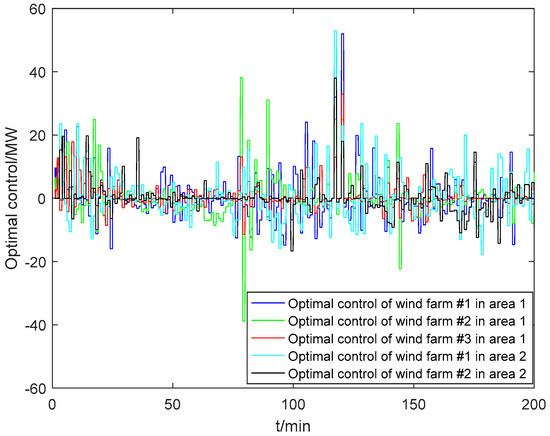In Figure 8, optimal control actions of all wind farms at each time-step under DMPC controller are shown. The optimal control is consisted of the first element in optimal control sequence at each time-step, and it is a control pulse signal delivered and applied to each wind farm by DMPC controller. It can be seen that the outputs of all wind farms are controlled in the range of [−60, 60] MW, which is the wind farm output constraint.