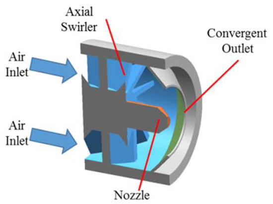 As shown in Figure 2, the inlet of the swirler is Section 1, the outlet of the swirler is Section 2, and the convergent outlet is Section 3.