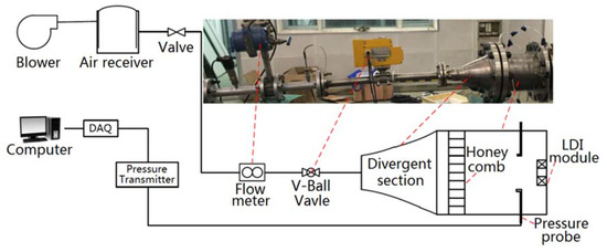 The mainstream air is provided by a twin-screw compressor, and the air flow enters the test section through the air tank and the ball valve. The air flow was measured by an orifice flow meter, whose accuracy of is 1%, and the inlet air flow was accurately adjusted through the V-ball valve. The air flow enters the measurement section through the expansion section. The honeycomb is used to straighten the air flow. Eight total pressure probes are arranged depending on equal area to obtain the average total pressure of the inlet. A Rosemount 3051S pressure transmitter measures the pressure signal with an accuracy of 0.2%. The downstream static pressure of the LDI module is atmospheric pressure, which is measured with a MPM484 pressure transmitter with an accuracy of 0.2%.