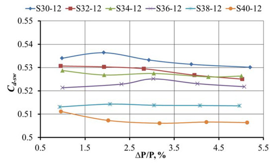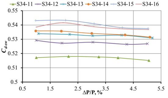 The effect of vane number on swirler discharge coefficient is shown in Figure 7. The horizontal coordinate is the pressure drop, and the vertical coordinate is the discharge coefficient. The discharge coefficient is almost unchanged with the increase of pressure drop, for the same reason as in Figure 5. As the vane number increases, the discharge coefficient first increases and then decreases, reaching the maximum at 15 vanes. It should be noticed that when the pressure drop is large than 4.0%, the discharge coefficient of S34-13 and S34-14 are approximately equal, which is different from the overall trend. The reason of this result is similar to the Section 4.1.1; however, the overall trend could also still be obtained.