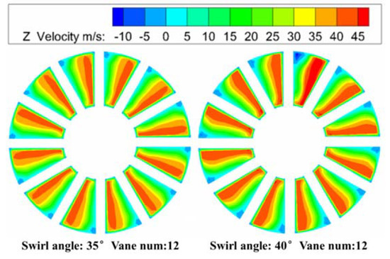 This is the axial velocity contour in the vane passage of the swirler when the swirl angle is 35° or 40°. The results indicated that the velocity difference between the suction side and pressure side is larger when the swirl angle is 40°, which indicated that the 40° swirler has a greater airflow separation.