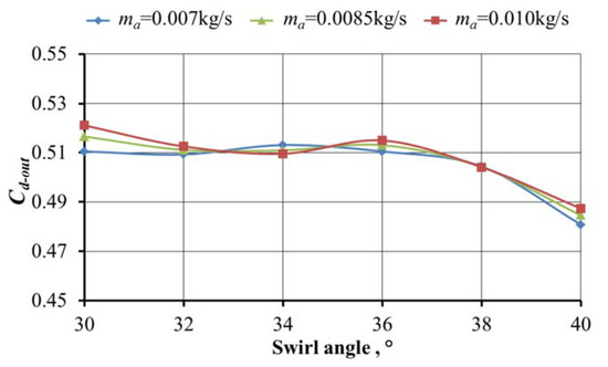 The relationship between the discharge coefficient of convergent outlet and the swirl angle at different air flow rates (corresponding to different pressure drops) is shown in Figure 8. As the swirl angle increases, the almost unchanged until the swirl angle is greater than 36°, decreases significantly and reaches a minimum value at a swirl angle of 40°.