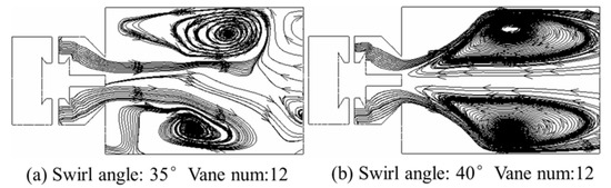 Figure 8 needs to be explained: (1) The convergent outlet could be considered as a circular hole, according to previous studies [13], if the air flow is straight at the inlet, the discharge coefficient of single-hole orifice is around 0.67. However, the discharge coefficient is significantly decreased under the swirl flow inlet conditions. This is because the swirl flow has a large tangential velocity compared to the straight flow, and the air flows radially outwards under the action of the centrifugal force, resulting in the decrease of the flow capacity, so the discharge coefficient is reduced. (2) When the swirl angle is greater than 36°, the discharge coefficient begins to drop significantly. This is because as the swirling flow gradually increases, vortex breakdown occurs at downstream of the convergent outlet, as shown in Figure 9b, the vortex breakdown appears as a stagnation point in the flow field, the stagnation point is followed by the center recirculation zone. The vortex breakdown bubble (VBB) in the flow field is equivalent to an obstacle [17], so the air will flow to the outside under the effect of VBB, further reducing its central flow capacity. When the swirling intensity is weak, as shown in Figure 9a, the swirling flow is not sufficient to form a central recirculation zone that blocks the flow in the downstream, so the discharge coefficient of the convergent outlet under the weak swirling flow is larger than that under the strong swirling flow.