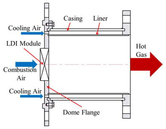 The gas turbine combustor is operating at high inlet temperature and pressure conditions, but the above investigations of discharge coefficient were carried out under normal temperature and pressure, which raises a question: whether the experimental results obtained at normal temperature and pressure conditions are still applicable at high temperature and pressure conditions with combustion. Therefore, in order to investigate the effective flow area of combustor under combustion conditions, the single-tube LDI combustor was proposed, as shown in Figure 11, the combustor consists of LDI module, liner, casing and dome flange.