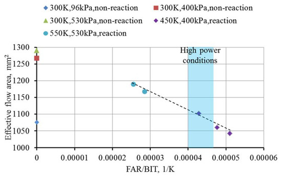 The results are shown in Figure 12, the horizontal ordinate is the ratio of Fuel Air Ratio (FAR) to Burner Inlet Temperature (BIT), which indicates the ratio of temperature rise to BIT ((Tt4 − Tt3)/Tt3). The FAR/BIT affects the combustor pressure loss due to combustion, and then affects the effective flow area. The vertical ordinate is effective flow area.