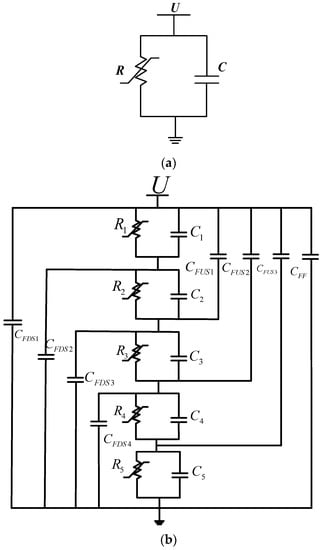 According to Section 1, MOAs have temperature-dependent non-linear V-I characteristics. Under power frequency voltage, the current flowing through the ZnO varistor can be divided into resistive and capacitive components. Therefore, the conventional circuit models of ZnO varistors and MOAs are built and shown in Figure 1 [18]. In this conventional model, five ZnO varistors are contained in the MOA; R, R1 to R5 represent the resistances of each varistor. C, C1 to C5 represent the stray capacitance of each varistor. CFF is the capacitance between the upper and lower flanges, CFUSi (i = 1, 2, 3) are the upper flange stray capacitances with spacers and aluminum sheets, and CFDSi (i = 1, 2, 3, 4) are the stray capacitances among the lower flange and spacers and aluminum sheets.
