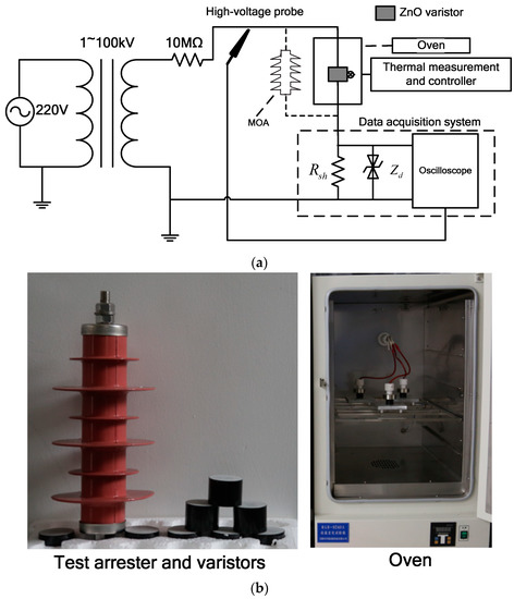 An experimental setup for the measurement of V–I–T characteristics under a power frequency-applied voltage is shown in Figure 4. As shown in Figure 4a, the experimental circuit mainly includes a high voltage transformer, an oven, a high voltage probe, and a data acquisition system. The high voltage transformer has an adjustable voltage between 0–10 kV. In the oven, there is a thermal sensor, a temperature controller, and a heater; it is possible to increase the temperature over 200 ± 3 °C in the oven. The data acquisition system includes a digital oscilloscope, back-to-back connected Zener diodes Zd for overvoltage protection, and a 470-Ω shunt resistor Rsh for leakage current measurements. The leakage current and applied voltage can be captured using a digital oscilloscope in the data acquisition system. The experimental setup in Figure 4 can be used to obtain the V–I characteristics of the ZnO varistors under different temperatures.