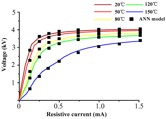 In order to validate the electric model of the MOA, the simulated V–I characteristics of the varistor at different temperatures are compared with the experimental results. As shown in Figure 7, for a constant temperature, 50 points on the V–I curve are measured, 42 points are used to build the ANN model, and eight points are used to validate the calculated results of the ANN model. From Figure 7, it can be confirmed that the simulated V–I–T characteristics obtained from the ANN model are in good agreement with the experimental results. It can also be seen that, under power frequency voltage, with an increasing varistor temperature, the equivalent varistor resistance become smaller.