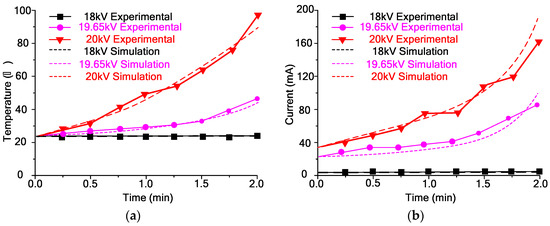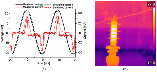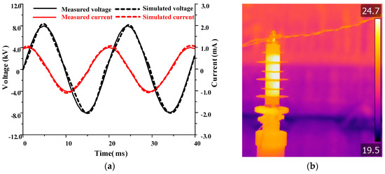 Due to switching or power system faults, the power frequency overvoltages applied on the MOA can be much higher than operation voltage. In order to monitor these conditions, a 17.4-kV AC overvoltage was applied on the arrester. The voltage applied on the MOA and the leakage current flowing through the varistors are shown in Figure 10a, while the thermal picture photographed by high quality thermal camera is shown in Figure 10b. As shown in Figure 10, when the arrester temperature is 27.9 °C and the applied voltage is 17.4 kV, the leakage current amplitude is about 40 mA. From Figure 10, it can also be seen that the simulated current curve can effectively reflect the amplitude of the experimental results.