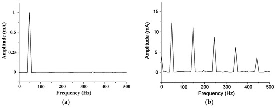 The frequency spectra of the leakage current in Figure 9 and Figure 10 are shown in Figure 11. As shown in Figure 11a, under normal working conditions, the applied voltage is in the linear section of the V–I characteristics curve, and the harmonics of the leakage current are so small that they can be neglected. When the applied voltage reaches the non-linear section, as shown in Figure 11b, the amplitudes and odd harmonics of the leakage current increase greatly.