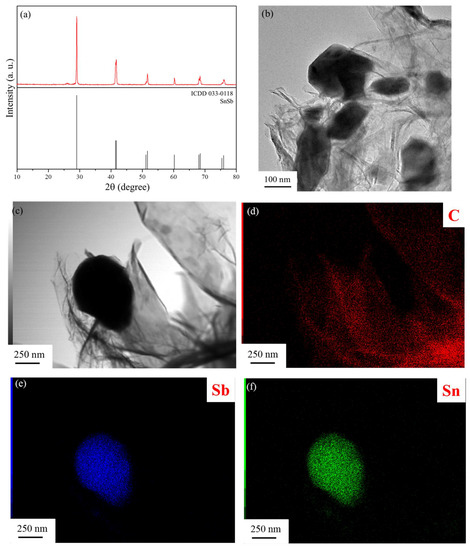 (a) XRD patterns of SnSb/RGO+C. (b) TEM image of SnSb/RGO. (c) SnSb single particle used for EDS mapping. (d) Distribution of graphene (carbon). (e) Distribution Sb. (f) Distribution Sn.