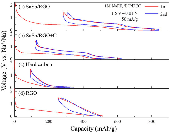 Figure 2 shows the voltage profiles of the first two cycles for the SnSb/GO+HC composite and its ingredients at a relatively low current density of 50 mA·g−1. The reversible capacities of the first cycle for SnSb/RGO, SnSb/RGO+HC, hard carbon and RGO are 534, 502, 248, and 259 mAh·g−1 with coulombic efficiencies of 65.2%, 77.2%, 72.8%, and 50.2%, respectively. As expected, SnSb/RGO delivers higher capacity due to the higher amount of the high capacity SnSb alloy, but SnSb/GO+HC blend shows superior reversibility. Clearly, composite ingredients are active towards Na, Sn, Sb, GO and HC and all react with Na. When considering the high-capacity ingredient SnSb, the first element to alloy with Na+ is expected to be Sb, followed by Sn: