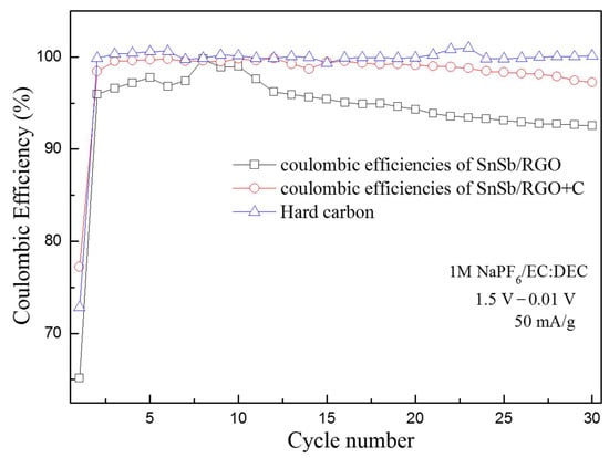 Coulombic efficiencies of SnSb/RGO, SnSb/RGO+C and hard carbon.