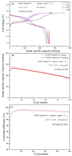 The voltage profiles of several selected cycles and the cycling performance of the full cells are shown in Figure 5. Even without thorough optimization, the NVPF//SnSb/RGO+HC cell shows reasonable cycling performance over 100 cycles (Figure 5b). The initial anode specific capacity in the NVPF//SnSb/RGO+C cell was 360/246 mAh·g−1 (charge/discharge), with coulombic efficiency of 68.47%. Notably, the NVPF//SnSb/RGO+C cell exhibits ~3.2 V cell voltage. The capacity retention after 100 cycles is about 70%.