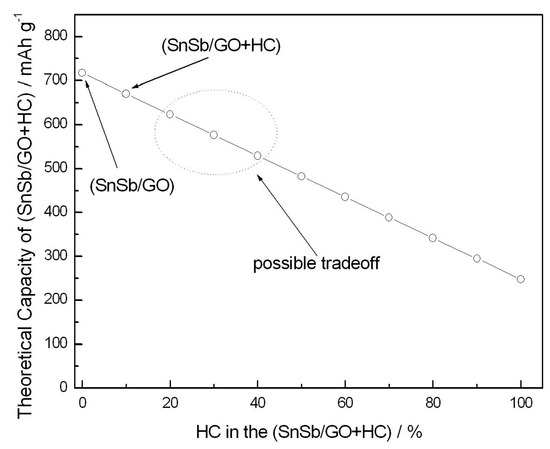 Further improvement of the reversibility and coulomb efficiency should be possible at the expense of somewhat reduced capacity. Figure 6 shows estimation of the (SnSb/GO+HC) composite capacity as a function of the HC content. The estimation is performed in accordance with Equation (3) showing linear decrease of the overall capacity with HC content. Compositions with higher amount of hard carbon and possibly another binder formulation are likely to show efficiency and cycle performance matching the requirements of practical sodium-ion batteries, which will be a topic of further investigations.