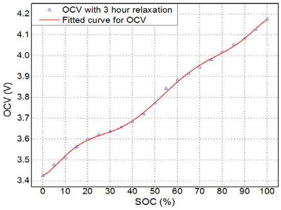 The OCV–SOC relationship, shown in Figure 2, was modeled by a seventh order polynomial function of SOC, as described by Equation (2).
