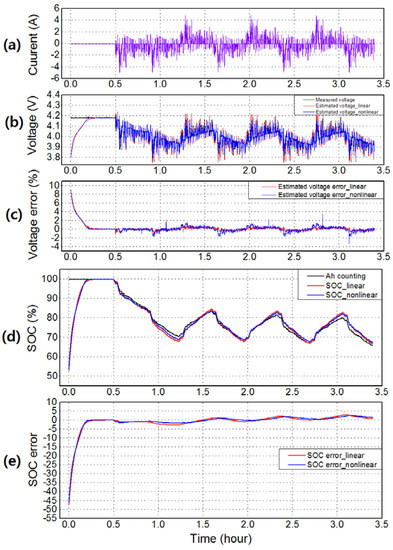 The SOC estimation errors are shown as percentages in Figure 6d. In the experiments, all initial SOC values of the cell were set to 30% to verify the convergence of the proposed algorithm.